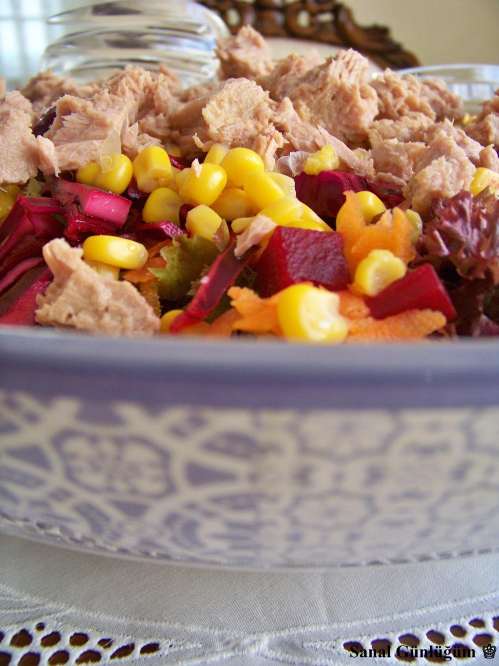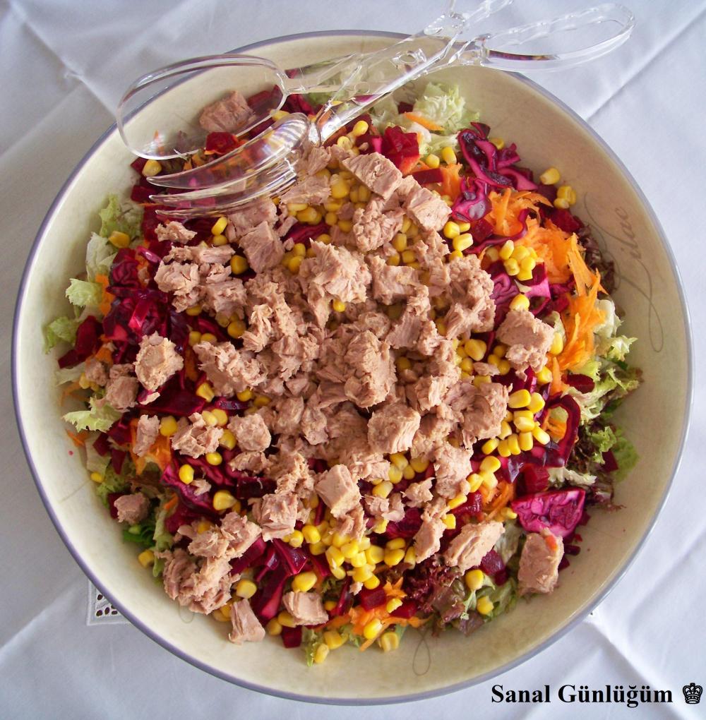 Salatalar >Ton Balıklı Salata Yazan: Elif on Kasım 30, 2012Nisan 14, 2013 Malzemeler: Roka Marul Akdeniz yeşillikleri Havuç Pancar turşusu Mor lahana Mısır 4 büyük kutu ton balığı Limon Sosu İçin: Limon Zeytinyağ Tuz Yapılışı: Önce mor lahanayı ince ince doğrayıp, 10-15 dakika kadar limon suyunda bekletin. Ardından havucu rendeleyip geri kalan malzemeleri doğrayın ve bütün malzemeleri bir kaba alıp, en son ton balığını üzerine koyun ve sosunu dökün. 🙂 Bunu paylaş: X'te paylaşmak için tıklayın (Yeni pencerede açılır) X Facebook'ta paylaşmak için tıklayın (Yeni pencerede açılır) Facebook Beğen Yükleniyor... İlgili