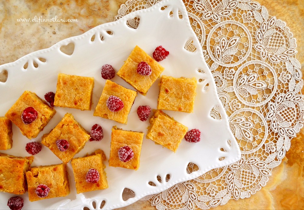 Servis ederken dilimlerin arasına ve üzerine frambuaz koyarak süsleyebilirsiniz.