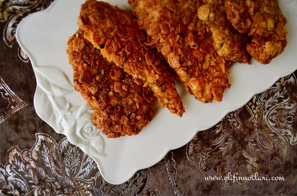 Tavukları önce una sonra yumurtaya en son Corn Flakes’li karışıma bulayın ve ısınmış zeytinyağında kızarmaya bırakın.