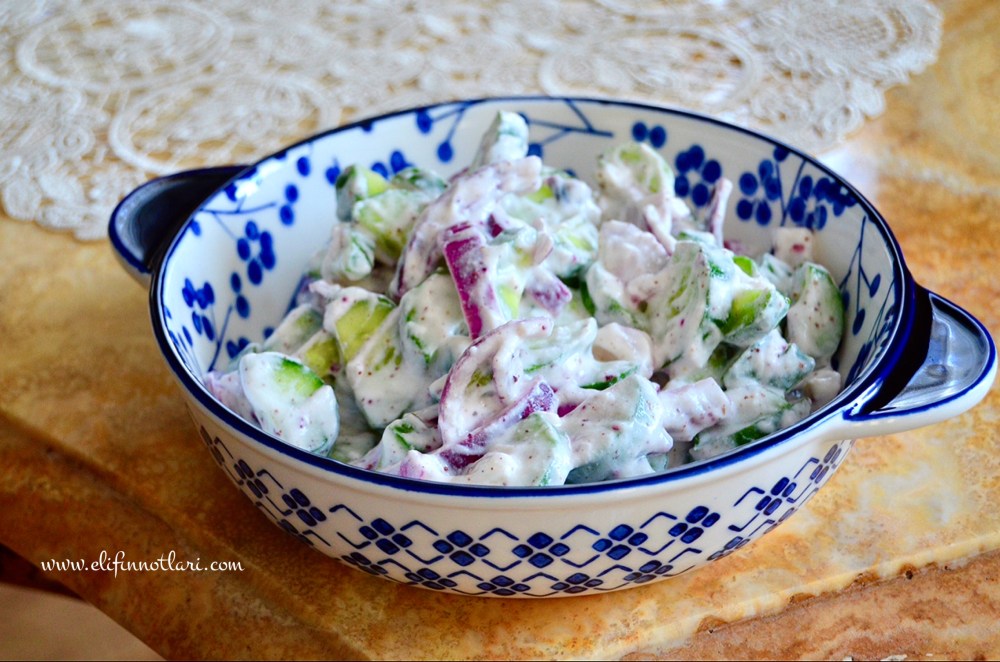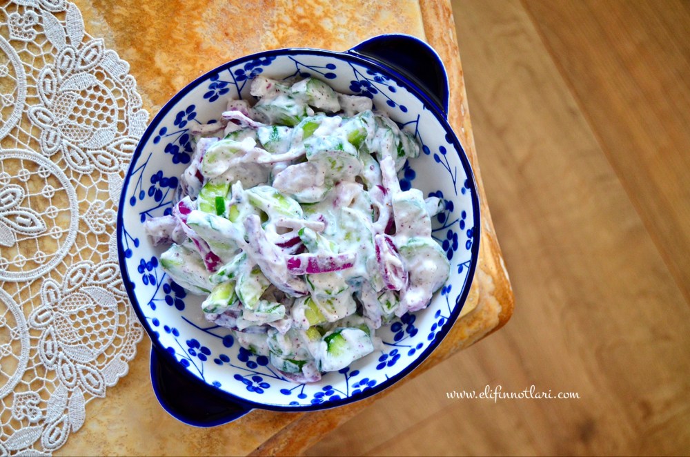 Salatalar >Kuru Soğanlı Cacık Yazan: Elif on Temmuz 3, 2019Ağustos 15, 2019 Malzemeler: (4 kişilik) 1 kg salatalık 1 adet büyük boy mor soğan 1 tatlı kaşığı sumak 1 tatlı kaşığı tuz 500 gr süzme yoğurt Yapılışı: Salatalıkları yarım ay şeklinde ince ince doğrayın. Soğanı dörde bölün ve ince ince doğrayın. Halkaları birbirinden ayırın. Bütün malzemeleri karıştırma kabında karıştırarak, servis kaselerine bölün. Afiyet Olsun! Bunu paylaş: X'te paylaşmak için tıklayın (Yeni pencerede açılır) X Facebook'ta paylaşmak için tıklayın (Yeni pencerede açılır) Facebook Beğen Yükleniyor... İlgili