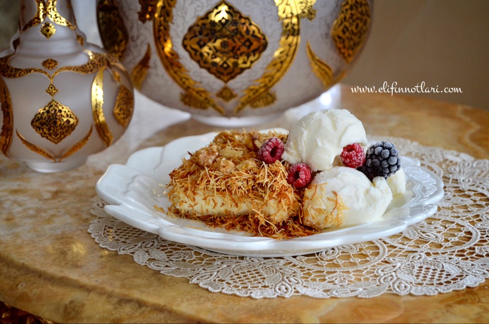 40×27’lik bir borcama kadayıfın yarısını yayın. Üzerine muhallebiyi dökün. Son olarak kalan kadayıfı da eşit bir şekilde üzerine yayın.