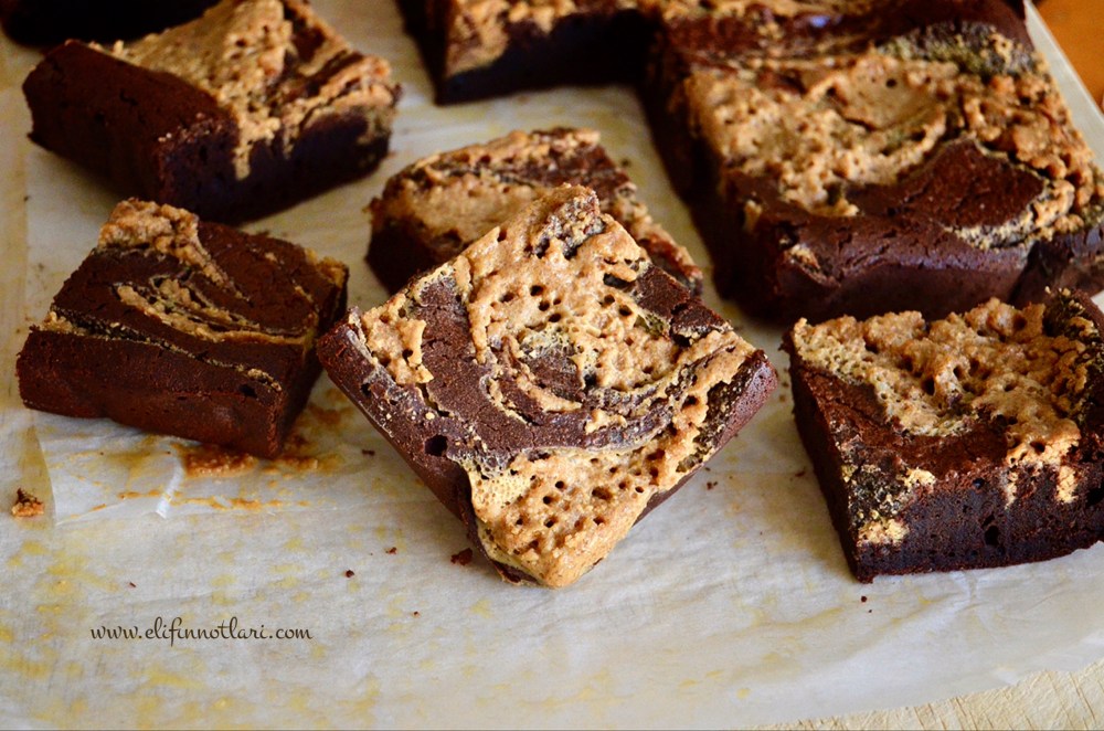Tatlı kaşığı ile tahin karşımından browninin üzerine aralıklı olarak bırakın. Ardından ucu sivri bir bıçak ya da çöp şiş gibi birşeyle üzerinden geçerek şekil verin.