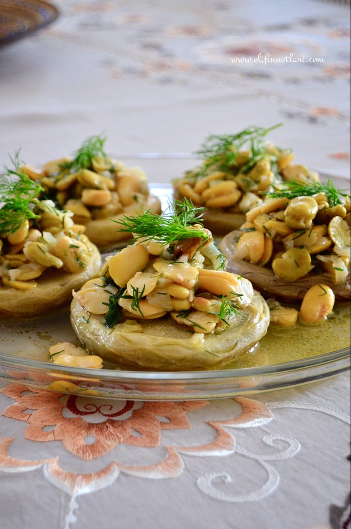 - Servis tabağına önce enginarları dizin. Ardından ince ince doğradığınız dereotunu iç bakla ile karıştırıp enginarların üzerine pay edin.