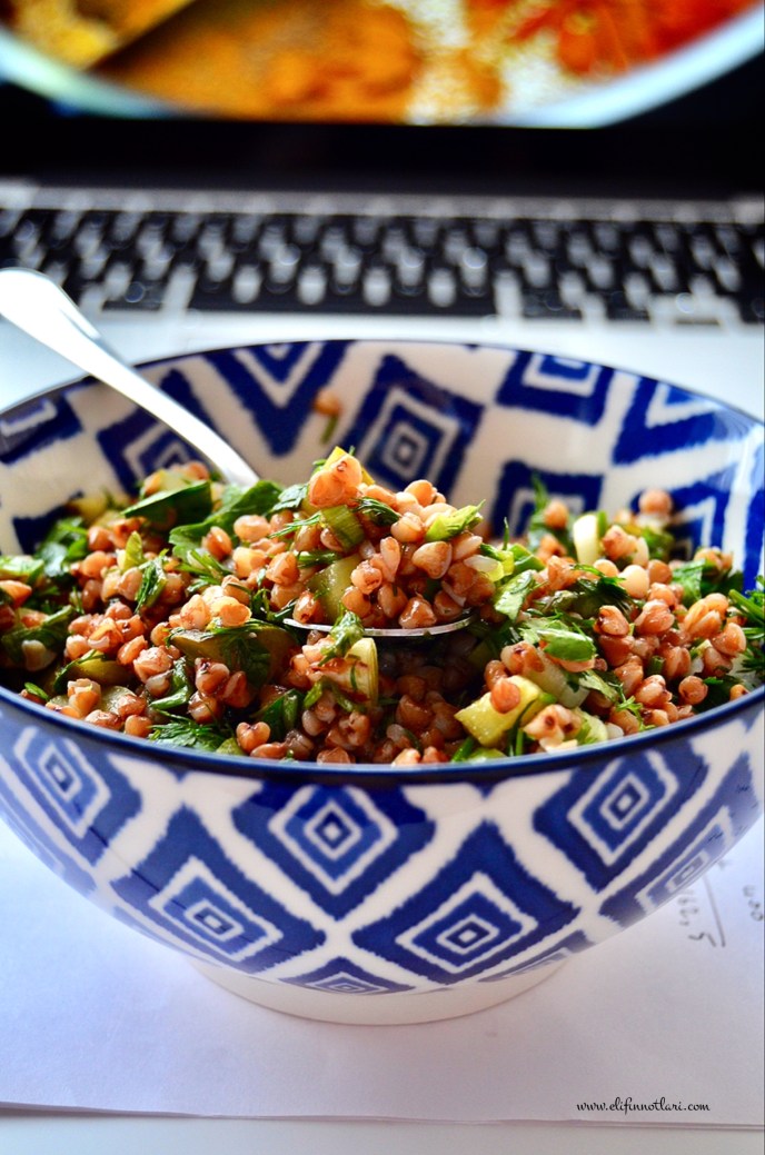 - Soğuyan karabuğdayı bir kaba alarak üzerine ince ince doğranmış taze soğan, dereotu, maydanoz ve küp küp doğranmış salatalık turşusunu ekleyin.